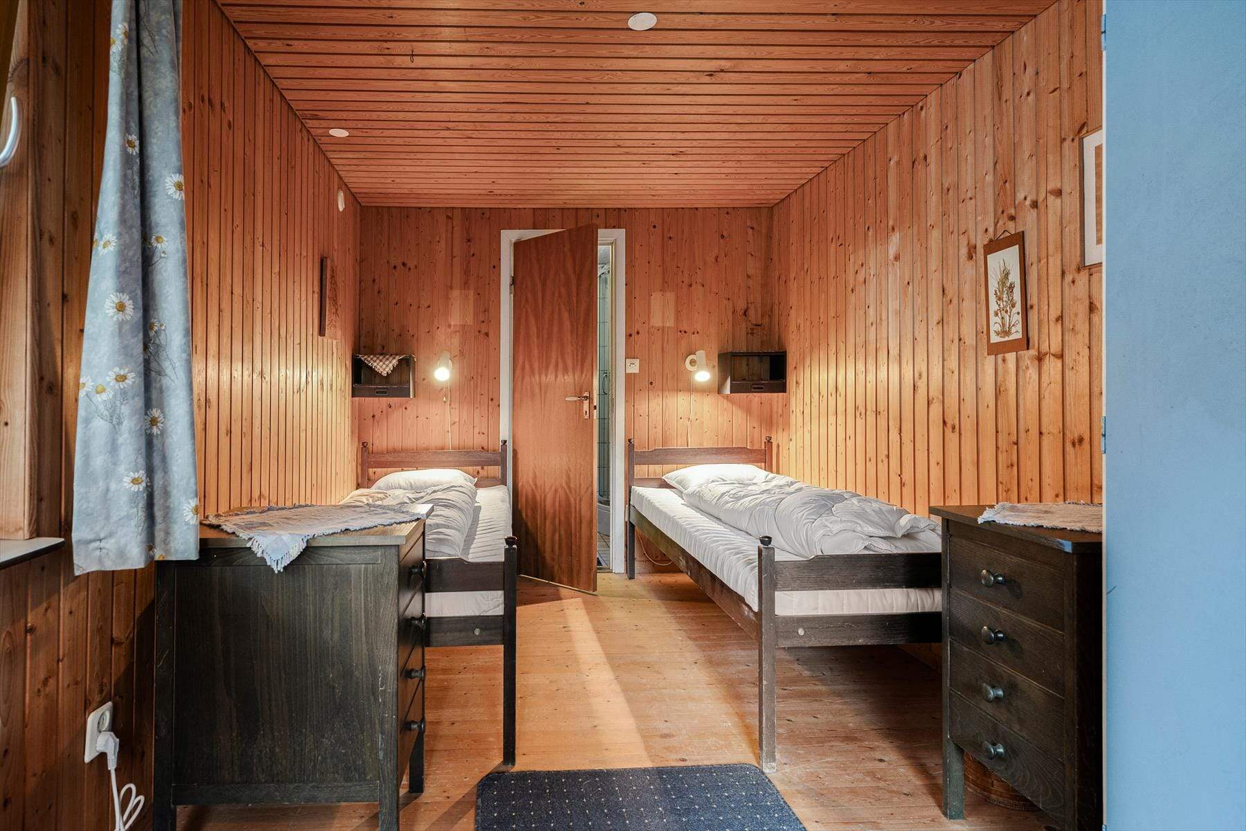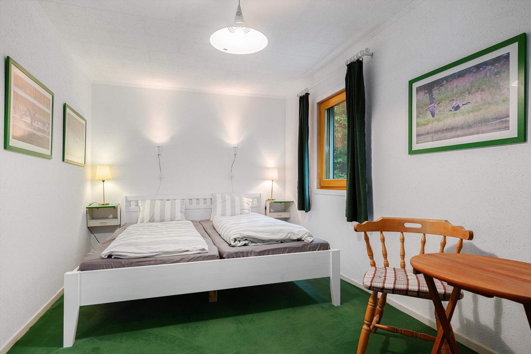 Zwei der drei Schlafzimmer befinden sich ebenfalls im Obergeschoss. Beide verfügen über je ein Doppelbett (bestehend aus zwei Matratzen). Das dritte Schlafzimmer befindet sich im Erdgeschoss und ist mit zwei Einzelbetten ausgestattet und verfügt über ein eigenes Badezimmer mit Dusche und WC. Das Erdgeschoss und das Obergeschoss sind räumlich getrennt und jeweils von außen über die Terrasse im Obergeschoss oder durch den Garageneingang im Erdgeschoss) betretbar.